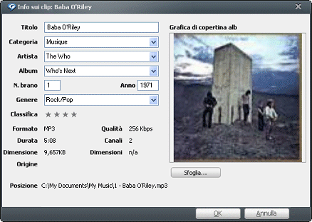 La finestra di dialogo "Info sui clip" consente di modificare o aggiungere tali informazioni: