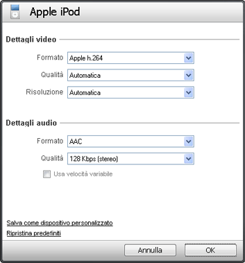 Le opzioni disponibili includono solo formati e impostazioni compatibili con il dispositivo selezionato.