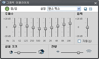 (기본값: 끄기) 이퀄라이저를 켜거나 끕니다. 버퍼링으로 인해 이퀄라이저를 켜거나 끄고 설정을 변경한 후 실제 작동하기까지 3초 가량 걸릴 수 있습니다. 일부 경우 이퀄라이저는 시스템 속도를 저하시킵니다. 이 경우 이퀄라이저를 끄면 컴퓨터가 정상 속도로 되돌아갑니다.