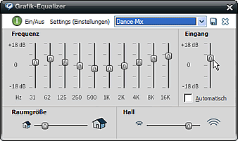 (Standardeinstellung ist "Aus") Schaltet den Equalizer ein oder aus. (Aufgrund der Zwischenspeicherung kann es bis zu drei Sekunden dauern, bis der durch Ein- oder Ausschalten des Equalizers oder die Änderung der Einstellungen erzielte Effekt hörbar ist.) In einigen Fällen kann der Equalizer die Systemleistung beeinträchtigen. Wenn Sie den Equalizer ausschalten, sollte Ihr Computer wieder mit normaler Geschwindigkeit arbeiten.